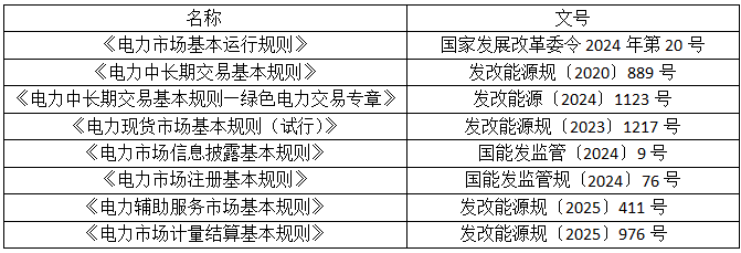 近年来,电力市场建设不断加快,截至目前,山西、广东、山东、甘肃、蒙西、湖北6个地区电力现货市场已转入正式运行,十多个省级现货市场进入长周期结算试运行阶段,南方区域电力市场启动连续结算试运行,跨电网经营区常态化电力交易机制正式建立。与此同时,全国统一电力市场“1+6”基础规则体系也逐步形成,其中,“1”指2024年生效的部门规章《电力市场基本运行规则》,其他六类规则(详见下表)为其下位规则,涉及中长期、现货、辅助服务三大市场和市场交易的若干核心环节。